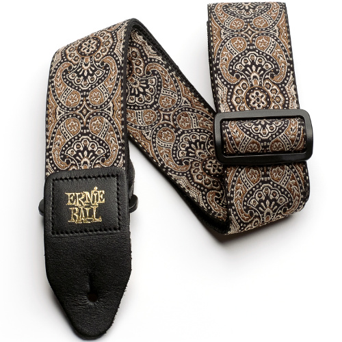 Pasek do gitary wykonany z trwałej i wygodnej polipropylenowej plecionki. Seria Polypro. Zakończenia skórzane. Regulowana długość od 104 cm do 182 cm. Wzór żakardowy: Gold & Black Paisley Jacquard Strap.