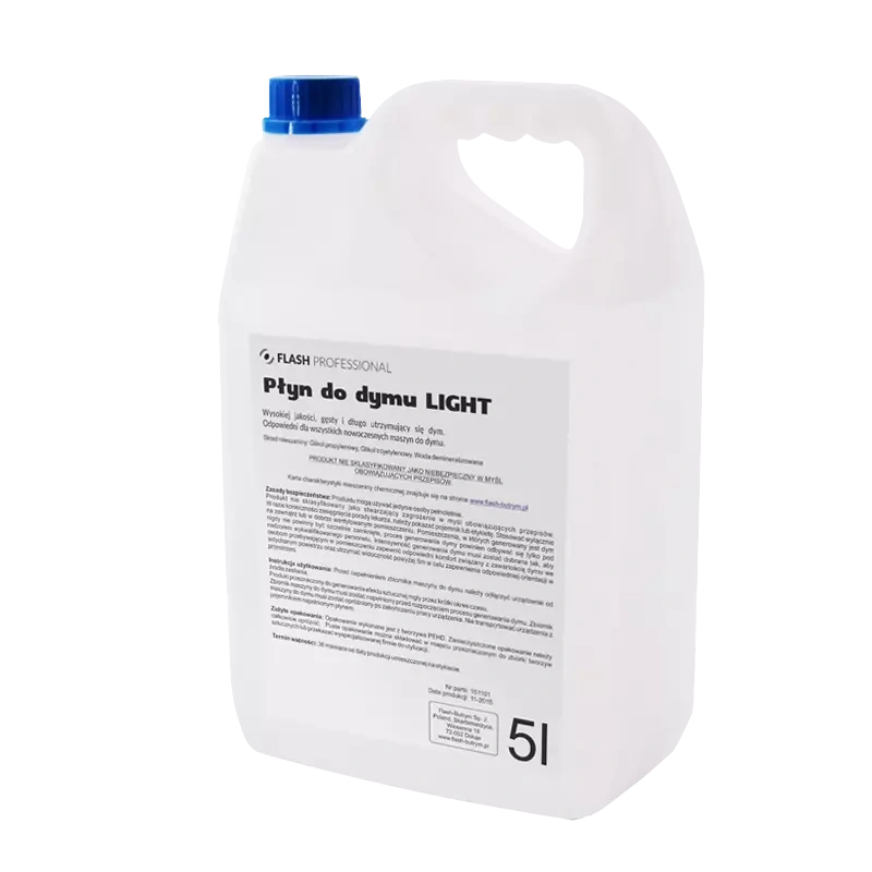 Wysokiej jakości płyn do wytwarzania dymu w wersji LIGHT, wyprodukowany w Polsce z certyfikatem CE.Dzięki naszej mieszaninie która jest bezzapachowa, bezbarwna, niepalna i nietoksyczna, uzyskasz efekt długo utrzymującego się dymu.Płyn jest substancją odpowiednią dla wszystkich nowoczesnych maszyn do dymu oraz bezpieczną w użyciu.